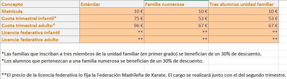 Finalmente, os dejamos los precios de la actividad, los cuales se mantienen respecto al curso pasado. Los cargos serán girados de forma trimestral.